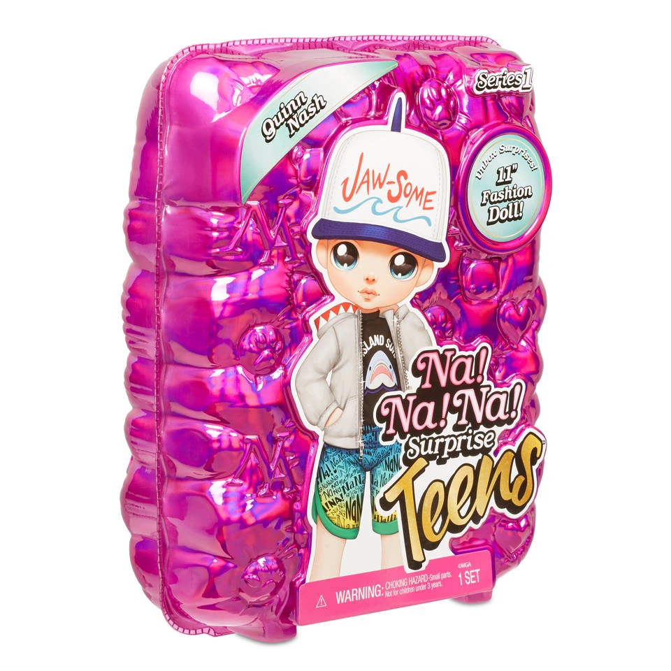 Breid je verzameling uit met deze heerlijk zachte Na! Na! Na! Surprise Teens modepop van Quinn Nash. Na! Na! Na! Surprise Teens zijn zachte modepoppen van 28 cm groot met heel veel persoonlijkheid en een glamourstijl. Quinn Nash heeft zich voor zijn look laten inspireren door een haai. Hij heeft cool, zilverkleurig haar, een geprint gezichtje en geprinte kledingdetails. Geniet van de ongelooflijke uitpakervaring. Open de verpakking en ontdek een schitterende pop. Laat dan de ballonnen knappen om al z’n mode en accessoires uit te pakken. Quinn Nash neemt graag een GROTE hap uit het leven. Hij is in zijn hoodie, zwembroek en surf-T-shirt klaar voor het strand. Hij draagt een pet met strandmotief en haaienvin en haaiensneakers. De geprinte details bestaan onder andere uit zijn haaiensokken en de pleister op zijn knie. Er zit ook een label bij met zijn naam, verjaardag en een verhaaltje. Verzamel alle supermooie, zachte Teens modepoppen. Deze poppen zijn met zorg gemaakt van superzacht pluche en gaan jaren mee. Ze zijn perfect om heel lang van te genieten en van te houden.