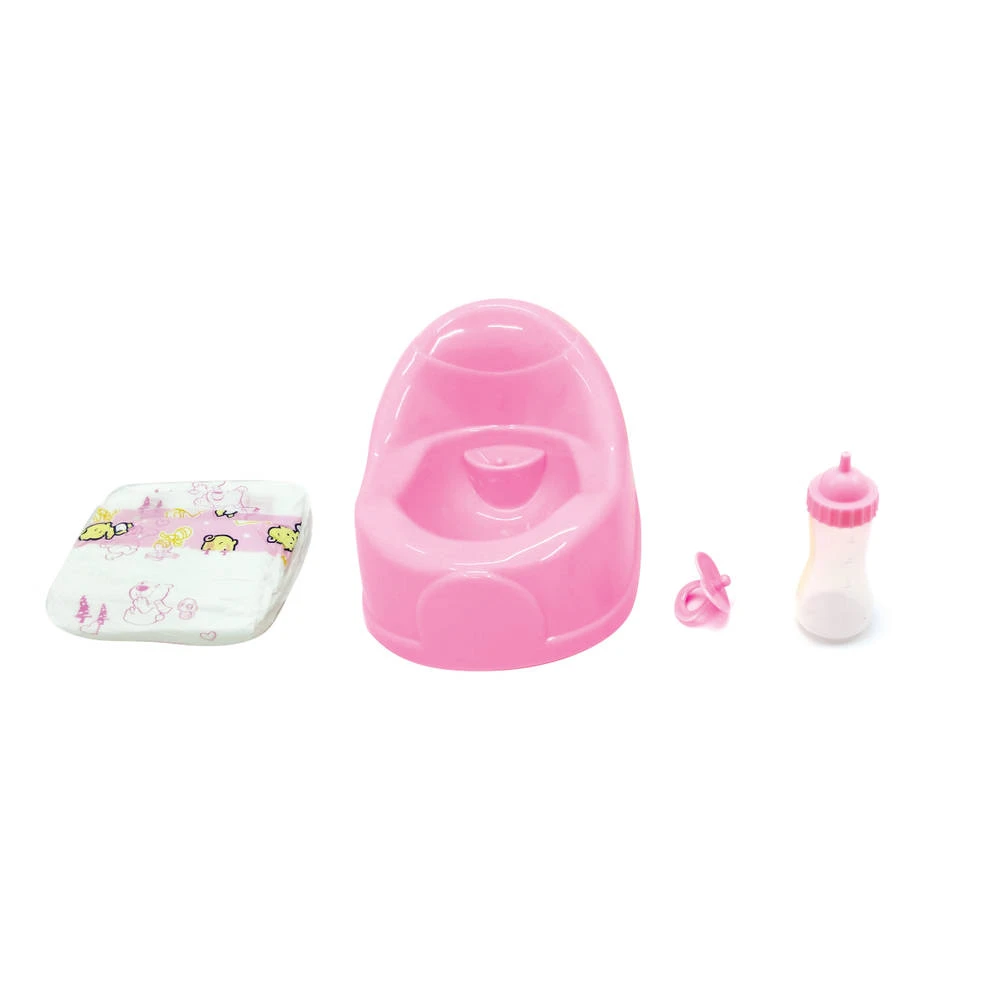 Met deze superschattige 4-delige poppenset heb je alles wat je nodig hebt om je babypop te verzorgen.