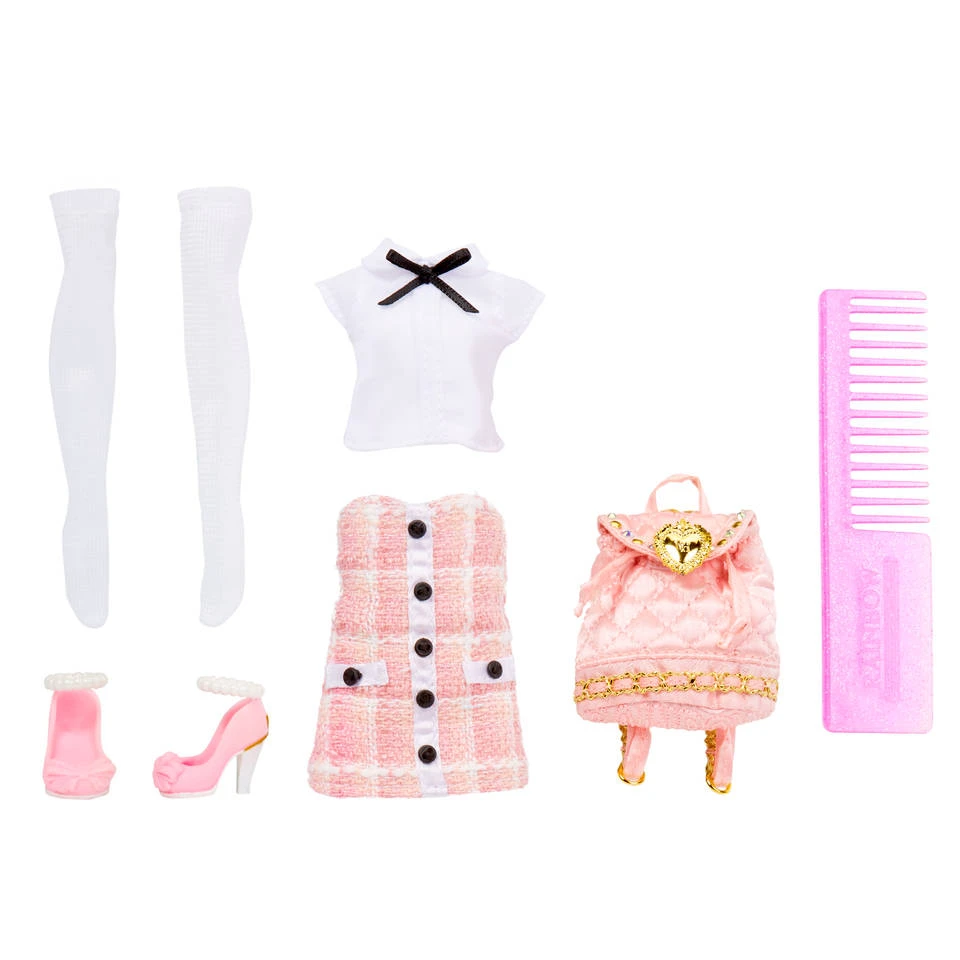 - De set bestaat uit een modepop, een complete poppenoutfit, een paar poppenschoenen, een paar sokken en poppenaccessoires: een rugzak van zachte stof die open en dicht kan, een haarstrik en een poppenkam.