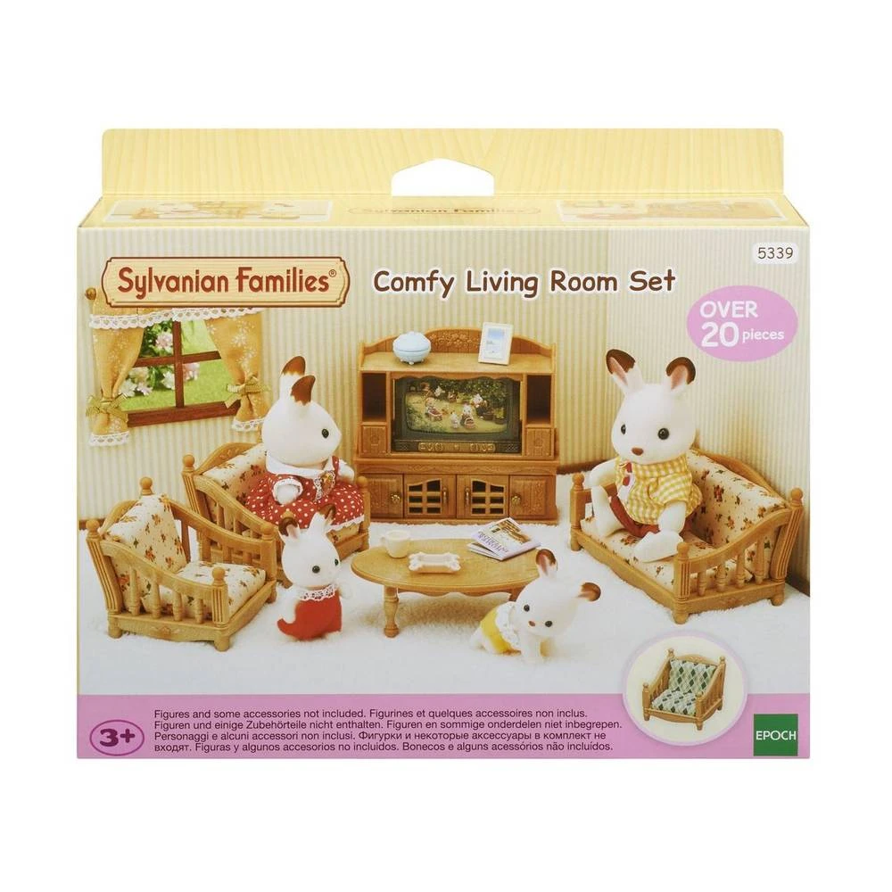 Je kunt je eigen leuke verhalen bedenken en naspelen met deze Sylvanian Families woonkamerset. Vader en moeder Chocoladekonijn zitten fijn tv te kijken. Wat is er vanavond allemaal te zien? De set is voorzien van een fotovel binnenin de tv die eruit kan worden gehaald om te vervangen door een andere om zo het tv-beeld te veranderen. De meegeleverde uitwisselbare materialen voor de bank en fauteuils zorgen voor eenvoudige ontwerpwijzigingen. De hele familie kan fijn zitten in deze gezellige set.